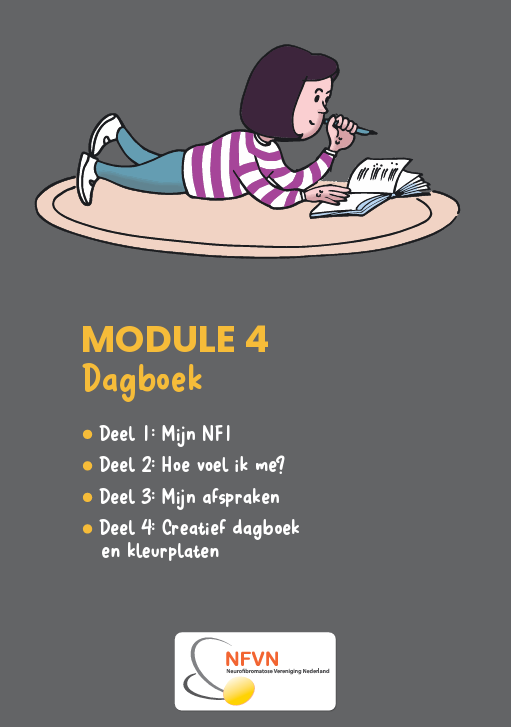 In het dagboek kunnen kinderen hun eigen ervaringen met NF1 opschrijven. Er is ruimte om bij te houden hoe je je voelt, afspraken te noteren en belangrijke dingen vast te leggen.